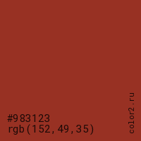 Цвет #983123 в цветовой модели RGB обозначается тремя октетами (152, 49, 35) в десятичном формате и #983123 в шестнадцатиричном (hex) формате, которые являются интенсивностью красного 152 (hex 98), интенсивность зелёного 49 (hex 31) и интенсивность синего 35 (hex 23).