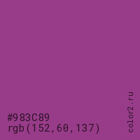 Цвет #983C89 в цветовой модели RGB обозначается тремя октетами (152, 60, 137) в десятичном формате и #983C89 в шестнадцатиричном (hex) формате, которые являются интенсивностью красного 152 (hex 98), интенсивность зелёного 60 (hex 3C) и интенсивность синего 137 (hex 89).