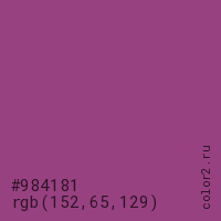 Цвет #984181 в цветовой модели RGB обозначается тремя октетами (152, 65, 129) в десятичном формате и #984181 в шестнадцатиричном (hex) формате, которые являются интенсивностью красного 152 (hex 98), интенсивность зелёного 65 (hex 41) и интенсивность синего 129 (hex 81).