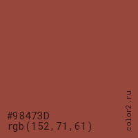 Цвет #98473D в цветовой модели RGB обозначается тремя октетами (152, 71, 61) в десятичном формате и #98473D в шестнадцатиричном (hex) формате, которые являются интенсивностью красного 152 (hex 98), интенсивность зелёного 71 (hex 47) и интенсивность синего 61 (hex 3D).