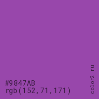 Цвет #9847AB в цветовой модели RGB обозначается тремя октетами (152, 71, 171) в десятичном формате и #9847AB в шестнадцатиричном (hex) формате, которые являются интенсивностью красного 152 (hex 98), интенсивность зелёного 71 (hex 47) и интенсивность синего 171 (hex AB).