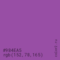 Цвет #984EA5 в цветовой модели RGB обозначается тремя октетами (152, 78, 165) в десятичном формате и #984EA5 в шестнадцатиричном (hex) формате, которые являются интенсивностью красного 152 (hex 98), интенсивность зелёного 78 (hex 4E) и интенсивность синего 165 (hex A5).
