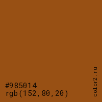 Цвет #985014 в цветовой модели RGB обозначается тремя октетами (152, 80, 20) в десятичном формате и #985014 в шестнадцатиричном (hex) формате, которые являются интенсивностью красного 152 (hex 98), интенсивность зелёного 80 (hex 50) и интенсивность синего 20 (hex 14).