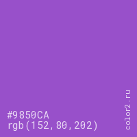 Цвет #9850CA в цветовой модели RGB обозначается тремя октетами (152, 80, 202) в десятичном формате и #9850CA в шестнадцатиричном (hex) формате, которые являются интенсивностью красного 152 (hex 98), интенсивность зелёного 80 (hex 50) и интенсивность синего 202 (hex CA).
