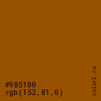Цвет #985100 в цветовой модели RGB обозначается тремя октетами (152, 81, 0) в десятичном формате и #985100 в шестнадцатиричном (hex) формате, которые являются интенсивностью красного 152 (hex 98), интенсивность зелёного 81 (hex 51) и интенсивность синего 0 (hex 00).