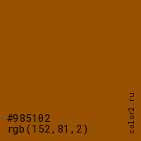 Цвет #985102 в цветовой модели RGB обозначается тремя октетами (152, 81, 2) в десятичном формате и #985102 в шестнадцатиричном (hex) формате, которые являются интенсивностью красного 152 (hex 98), интенсивность зелёного 81 (hex 51) и интенсивность синего 2 (hex 02).
