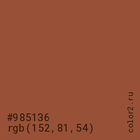 Цвет #985136 в цветовой модели RGB обозначается тремя октетами (152, 81, 54) в десятичном формате и #985136 в шестнадцатиричном (hex) формате, которые являются интенсивностью красного 152 (hex 98), интенсивность зелёного 81 (hex 51) и интенсивность синего 54 (hex 36).