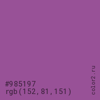 Цвет #985197 в цветовой модели RGB обозначается тремя октетами (152, 81, 151) в десятичном формате и #985197 в шестнадцатиричном (hex) формате, которые являются интенсивностью красного 152 (hex 98), интенсивность зелёного 81 (hex 51) и интенсивность синего 151 (hex 97).