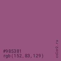 Цвет #985381 в цветовой модели RGB обозначается тремя октетами (152, 83, 129) в десятичном формате и #985381 в шестнадцатиричном (hex) формате, которые являются интенсивностью красного 152 (hex 98), интенсивность зелёного 83 (hex 53) и интенсивность синего 129 (hex 81).