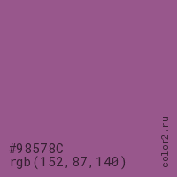 Цвет #98578C в цветовой модели RGB обозначается тремя октетами (152, 87, 140) в десятичном формате и #98578C в шестнадцатиричном (hex) формате, которые являются интенсивностью красного 152 (hex 98), интенсивность зелёного 87 (hex 57) и интенсивность синего 140 (hex 8C).