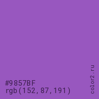 Цвет #9857BF в цветовой модели RGB обозначается тремя октетами (152, 87, 191) в десятичном формате и #9857BF в шестнадцатиричном (hex) формате, которые являются интенсивностью красного 152 (hex 98), интенсивность зелёного 87 (hex 57) и интенсивность синего 191 (hex BF).