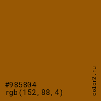 Цвет #985804 в цветовой модели RGB обозначается тремя октетами (152, 88, 4) в десятичном формате и #985804 в шестнадцатиричном (hex) формате, которые являются интенсивностью красного 152 (hex 98), интенсивность зелёного 88 (hex 58) и интенсивность синего 4 (hex 04).