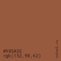 Цвет #985A3E в цветовой модели RGB обозначается тремя октетами (152, 90, 62) в десятичном формате и #985A3E в шестнадцатиричном (hex) формате, которые являются интенсивностью красного 152 (hex 98), интенсивность зелёного 90 (hex 5A) и интенсивность синего 62 (hex 3E).