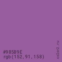 Цвет #985B9E в цветовой модели RGB обозначается тремя октетами (152, 91, 158) в десятичном формате и #985B9E в шестнадцатиричном (hex) формате, которые являются интенсивностью красного 152 (hex 98), интенсивность зелёного 91 (hex 5B) и интенсивность синего 158 (hex 9E).
