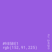 Цвет #985BE1 в цветовой модели RGB обозначается тремя октетами (152, 91, 225) в десятичном формате и #985BE1 в шестнадцатиричном (hex) формате, которые являются интенсивностью красного 152 (hex 98), интенсивность зелёного 91 (hex 5B) и интенсивность синего 225 (hex E1).