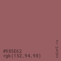 Цвет #985E62 в цветовой модели RGB обозначается тремя октетами (152, 94, 98) в десятичном формате и #985E62 в шестнадцатиричном (hex) формате, которые являются интенсивностью красного 152 (hex 98), интенсивность зелёного 94 (hex 5E) и интенсивность синего 98 (hex 62).