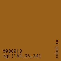 Цвет #986018 в цветовой модели RGB обозначается тремя октетами (152, 96, 24) в десятичном формате и #986018 в шестнадцатиричном (hex) формате, которые являются интенсивностью красного 152 (hex 98), интенсивность зелёного 96 (hex 60) и интенсивность синего 24 (hex 18).