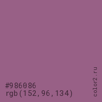 Цвет #986086 в цветовой модели RGB обозначается тремя октетами (152, 96, 134) в десятичном формате и #986086 в шестнадцатиричном (hex) формате, которые являются интенсивностью красного 152 (hex 98), интенсивность зелёного 96 (hex 60) и интенсивность синего 134 (hex 86).