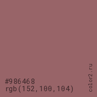 Цвет #986468 в цветовой модели RGB обозначается тремя октетами (152, 100, 104) в десятичном формате и #986468 в шестнадцатиричном (hex) формате, которые являются интенсивностью красного 152 (hex 98), интенсивность зелёного 100 (hex 64) и интенсивность синего 104 (hex 68).