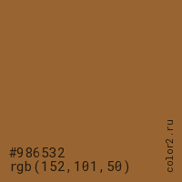 Цвет #986532 в цветовой модели RGB обозначается тремя октетами (152, 101, 50) в десятичном формате и #986532 в шестнадцатиричном (hex) формате, которые являются интенсивностью красного 152 (hex 98), интенсивность зелёного 101 (hex 65) и интенсивность синего 50 (hex 32).