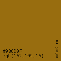 Цвет #986D0F в цветовой модели RGB обозначается тремя октетами (152, 109, 15) в десятичном формате и #986D0F в шестнадцатиричном (hex) формате, которые являются интенсивностью красного 152 (hex 98), интенсивность зелёного 109 (hex 6D) и интенсивность синего 15 (hex 0F).