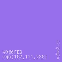 Цвет #986FEB в цветовой модели RGB обозначается тремя октетами (152, 111, 235) в десятичном формате и #986FEB в шестнадцатиричном (hex) формате, которые являются интенсивностью красного 152 (hex 98), интенсивность зелёного 111 (hex 6F) и интенсивность синего 235 (hex EB).