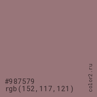 Цвет #987579 в цветовой модели RGB обозначается тремя октетами (152, 117, 121) в десятичном формате и #987579 в шестнадцатиричном (hex) формате, которые являются интенсивностью красного 152 (hex 98), интенсивность зелёного 117 (hex 75) и интенсивность синего 121 (hex 79).