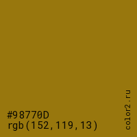 Цвет #98770D в цветовой модели RGB обозначается тремя октетами (152, 119, 13) в десятичном формате и #98770D в шестнадцатиричном (hex) формате, которые являются интенсивностью красного 152 (hex 98), интенсивность зелёного 119 (hex 77) и интенсивность синего 13 (hex 0D).