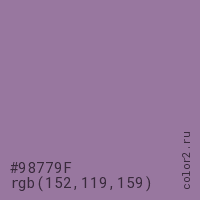 Цвет #98779F в цветовой модели RGB обозначается тремя октетами (152, 119, 159) в десятичном формате и #98779F в шестнадцатиричном (hex) формате, которые являются интенсивностью красного 152 (hex 98), интенсивность зелёного 119 (hex 77) и интенсивность синего 159 (hex 9F).