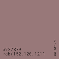 Цвет #987879 в цветовой модели RGB обозначается тремя октетами (152, 120, 121) в десятичном формате и #987879 в шестнадцатиричном (hex) формате, которые являются интенсивностью красного 152 (hex 98), интенсивность зелёного 120 (hex 78) и интенсивность синего 121 (hex 79).