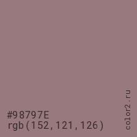 Цвет #98797E в цветовой модели RGB обозначается тремя октетами (152, 121, 126) в десятичном формате и #98797E в шестнадцатиричном (hex) формате, которые являются интенсивностью красного 152 (hex 98), интенсивность зелёного 121 (hex 79) и интенсивность синего 126 (hex 7E).