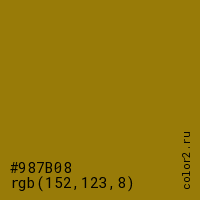Цвет #987B08 в цветовой модели RGB обозначается тремя октетами (152, 123, 8) в десятичном формате и #987B08 в шестнадцатиричном (hex) формате, которые являются интенсивностью красного 152 (hex 98), интенсивность зелёного 123 (hex 7B) и интенсивность синего 8 (hex 08).