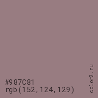 Цвет #987C81 в цветовой модели RGB обозначается тремя октетами (152, 124, 129) в десятичном формате и #987C81 в шестнадцатиричном (hex) формате, которые являются интенсивностью красного 152 (hex 98), интенсивность зелёного 124 (hex 7C) и интенсивность синего 129 (hex 81).