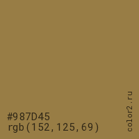 Цвет #987D45 в цветовой модели RGB обозначается тремя октетами (152, 125, 69) в десятичном формате и #987D45 в шестнадцатиричном (hex) формате, которые являются интенсивностью красного 152 (hex 98), интенсивность зелёного 125 (hex 7D) и интенсивность синего 69 (hex 45).