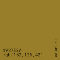 Цвет #987E2A в цветовой модели RGB обозначается тремя октетами (152, 126, 42) в десятичном формате и #987E2A в шестнадцатиричном (hex) формате, которые являются интенсивностью красного 152 (hex 98), интенсивность зелёного 126 (hex 7E) и интенсивность синего 42 (hex 2A).
