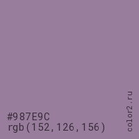 Цвет #987E9C в цветовой модели RGB обозначается тремя октетами (152, 126, 156) в десятичном формате и #987E9C в шестнадцатиричном (hex) формате, которые являются интенсивностью красного 152 (hex 98), интенсивность зелёного 126 (hex 7E) и интенсивность синего 156 (hex 9C).