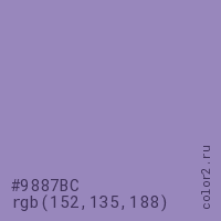 Цвет #9887BC в цветовой модели RGB обозначается тремя октетами (152, 135, 188) в десятичном формате и #9887BC в шестнадцатиричном (hex) формате, которые являются интенсивностью красного 152 (hex 98), интенсивность зелёного 135 (hex 87) и интенсивность синего 188 (hex BC).