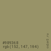 Цвет #989368 в цветовой модели RGB обозначается тремя октетами (152, 147, 104) в десятичном формате и #989368 в шестнадцатиричном (hex) формате, которые являются интенсивностью красного 152 (hex 98), интенсивность зелёного 147 (hex 93) и интенсивность синего 104 (hex 68).