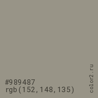 Цвет #989487 в цветовой модели RGB обозначается тремя октетами (152, 148, 135) в десятичном формате и #989487 в шестнадцатиричном (hex) формате, которые являются интенсивностью красного 152 (hex 98), интенсивность зелёного 148 (hex 94) и интенсивность синего 135 (hex 87).