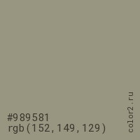 Цвет #989581 в цветовой модели RGB обозначается тремя октетами (152, 149, 129) в десятичном формате и #989581 в шестнадцатиричном (hex) формате, которые являются интенсивностью красного 152 (hex 98), интенсивность зелёного 149 (hex 95) и интенсивность синего 129 (hex 81).