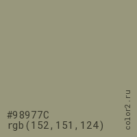 Цвет #98977C в цветовой модели RGB обозначается тремя октетами (152, 151, 124) в десятичном формате и #98977C в шестнадцатиричном (hex) формате, которые являются интенсивностью красного 152 (hex 98), интенсивность зелёного 151 (hex 97) и интенсивность синего 124 (hex 7C).