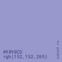Цвет #9898CD в цветовой модели RGB обозначается тремя октетами (152, 152, 205) в десятичном формате и #9898CD в шестнадцатиричном (hex) формате, которые являются интенсивностью красного 152 (hex 98), интенсивность зелёного 152 (hex 98) и интенсивность синего 205 (hex CD).