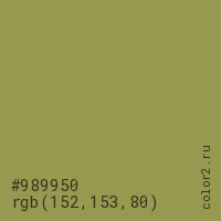 Цвет #989950 в цветовой модели RGB обозначается тремя октетами (152, 153, 80) в десятичном формате и #989950 в шестнадцатиричном (hex) формате, которые являются интенсивностью красного 152 (hex 98), интенсивность зелёного 153 (hex 99) и интенсивность синего 80 (hex 50).