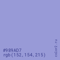 Цвет #989AD7 в цветовой модели RGB обозначается тремя октетами (152, 154, 215) в десятичном формате и #989AD7 в шестнадцатиричном (hex) формате, которые являются интенсивностью красного 152 (hex 98), интенсивность зелёного 154 (hex 9A) и интенсивность синего 215 (hex D7).