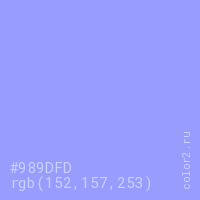 Цвет #989DFD в цветовой модели RGB обозначается тремя октетами (152, 157, 253) в десятичном формате и #989DFD в шестнадцатиричном (hex) формате, которые являются интенсивностью красного 152 (hex 98), интенсивность зелёного 157 (hex 9D) и интенсивность синего 253 (hex FD).