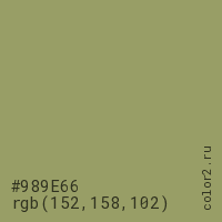 Цвет #989E66 в цветовой модели RGB обозначается тремя октетами (152, 158, 102) в десятичном формате и #989E66 в шестнадцатиричном (hex) формате, которые являются интенсивностью красного 152 (hex 98), интенсивность зелёного 158 (hex 9E) и интенсивность синего 102 (hex 66).