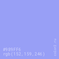 Цвет #989FF6 в цветовой модели RGB обозначается тремя октетами (152, 159, 246) в десятичном формате и #989FF6 в шестнадцатиричном (hex) формате, которые являются интенсивностью красного 152 (hex 98), интенсивность зелёного 159 (hex 9F) и интенсивность синего 246 (hex F6).