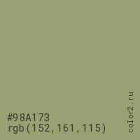 Цвет #98A173 в цветовой модели RGB обозначается тремя октетами (152, 161, 115) в десятичном формате и #98A173 в шестнадцатиричном (hex) формате, которые являются интенсивностью красного 152 (hex 98), интенсивность зелёного 161 (hex A1) и интенсивность синего 115 (hex 73).