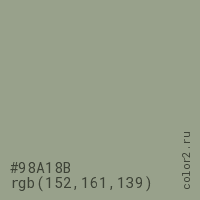 Цвет #98A18B в цветовой модели RGB обозначается тремя октетами (152, 161, 139) в десятичном формате и #98A18B в шестнадцатиричном (hex) формате, которые являются интенсивностью красного 152 (hex 98), интенсивность зелёного 161 (hex A1) и интенсивность синего 139 (hex 8B).