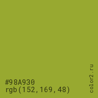 Цвет #98A930 в цветовой модели RGB обозначается тремя октетами (152, 169, 48) в десятичном формате и #98A930 в шестнадцатиричном (hex) формате, которые являются интенсивностью красного 152 (hex 98), интенсивность зелёного 169 (hex A9) и интенсивность синего 48 (hex 30).